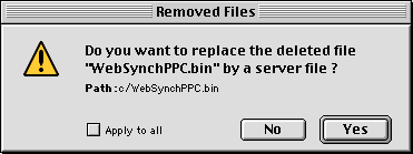 This dialog appears if you removed a file in you local directory and open the related document (Or you ask to update the folder where the file is). You can select 'Apply to all' and then choose you answer which will be applied as the default answer for all the removed files. (See Server File)